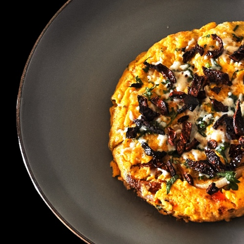 Deliciosa tortilla elaborada con huevo, chorizo, cebolla caramelizada, queso de cabra y ensalada de tomates al orégano.