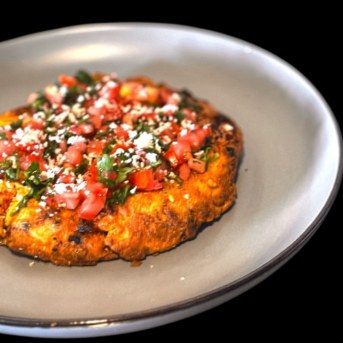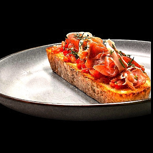 Elaborado con pan de masa madre, tomate rayado, ajo, perejil, queso fresco y jamón serrano, acompañado por ensalada del día.