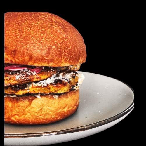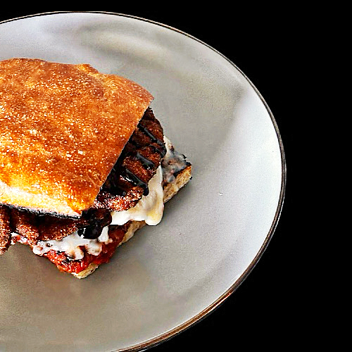 Focaccia sandwich, milanesa de res empanizada, salsa pommodoro, queso gouda y toques de reducción balsámica.