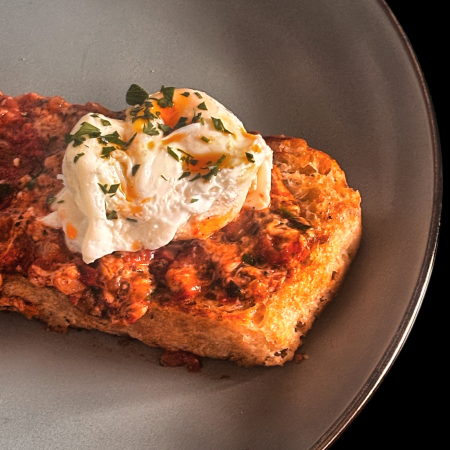 Pan de masa madre terminado en mantequilla, sofrito turco de tomate y especias, huevo pochado y queso feta fundido. imperdible experiencia.