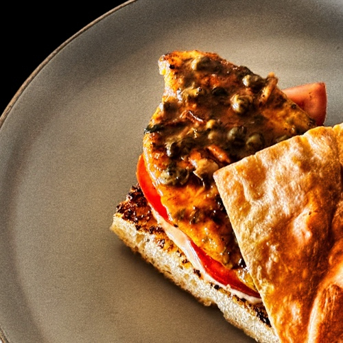 Focaccia sandwich,pollo cociinado en mantequilla de alcaparras, salsa de vino blanco, tomates asados y toques de aceite de oliva, increible sabor ahumado.