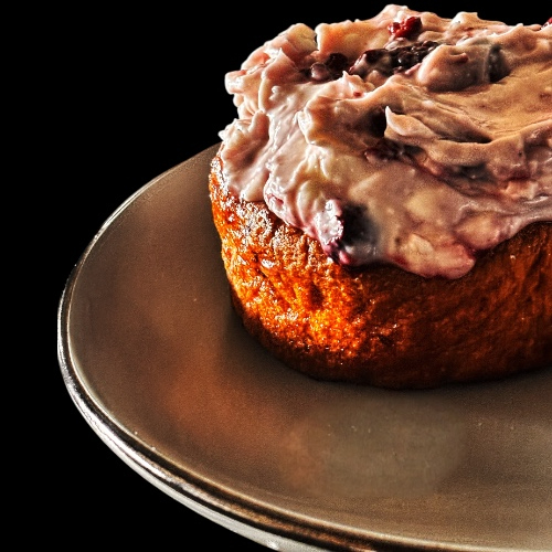 Roll de masa danesa, mermelada de frutos rojos y queso crema.