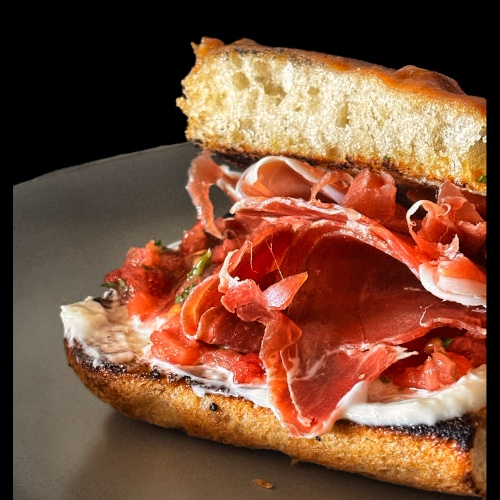 Foccaccia terminada en mantequilla, alioli de ajo, tomate rayado,y jamón serrano. Imperdible.