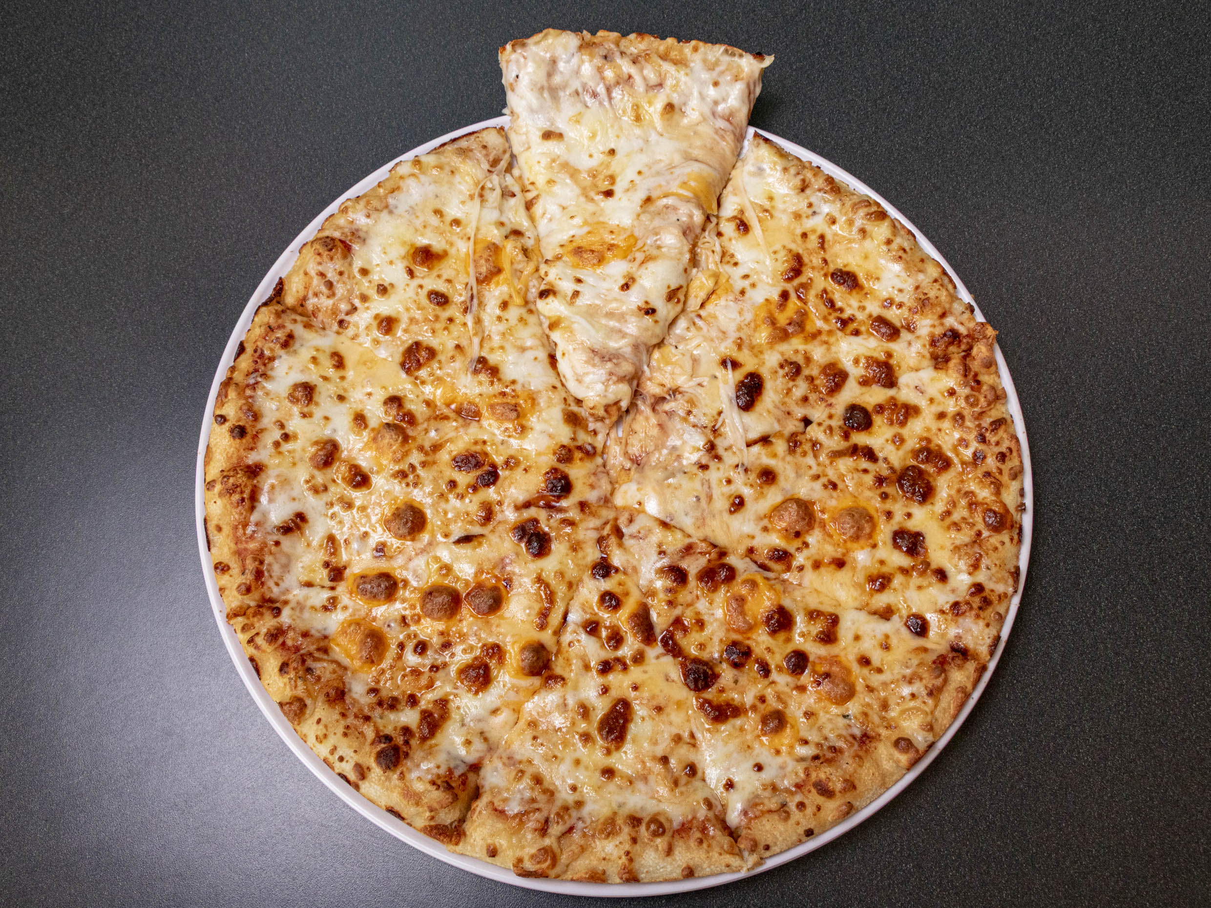 Pizza grande mezclada con queso mozzarella, gouda, añejo y cheddar, elaborada con salsa de tomate. (No se puede personalizar o ingredientes extras). No incluye chimichurri.
