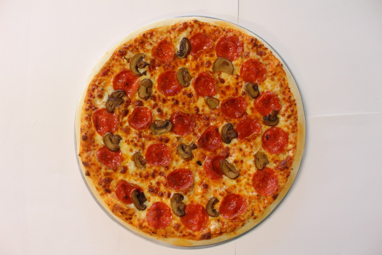 Pizza grande con pepperoni y champiñones, elaborada con salsa de tomate y queso mozzarella. (No se puede personalizar o ingredientes extras). No incluye chimichurri.