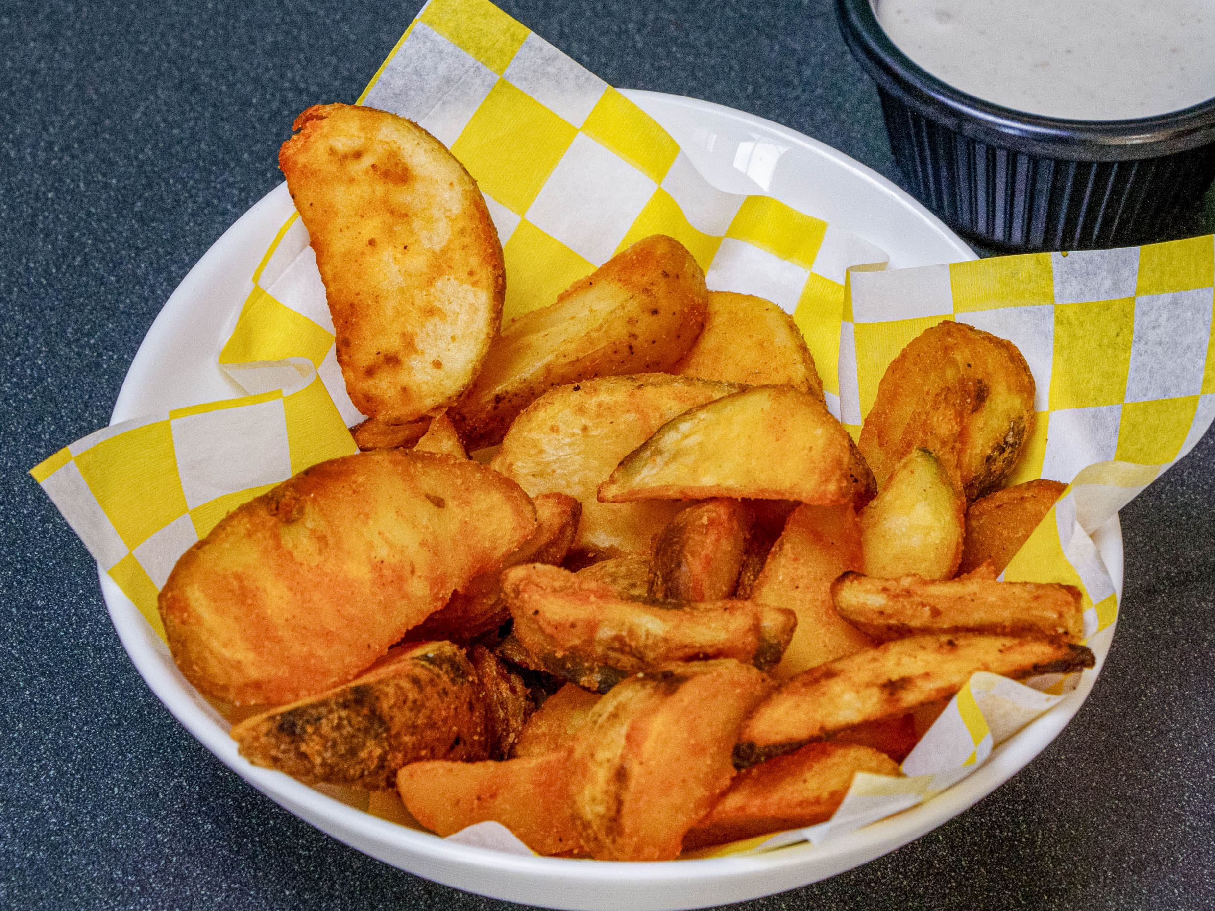 200 g Papas gajo condimentadas horneadas. Incluye aderezo ranch.