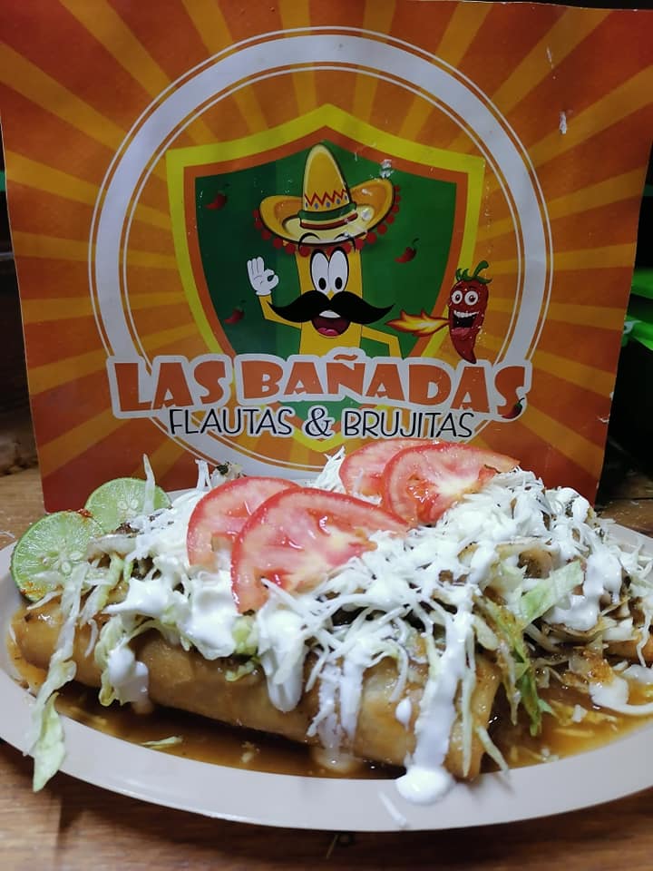 5 Flautas de papa acompañadas de repollo, jitomate, cuerito curtido, crema, queso rallado, bañadas en salsa especial de la casa.