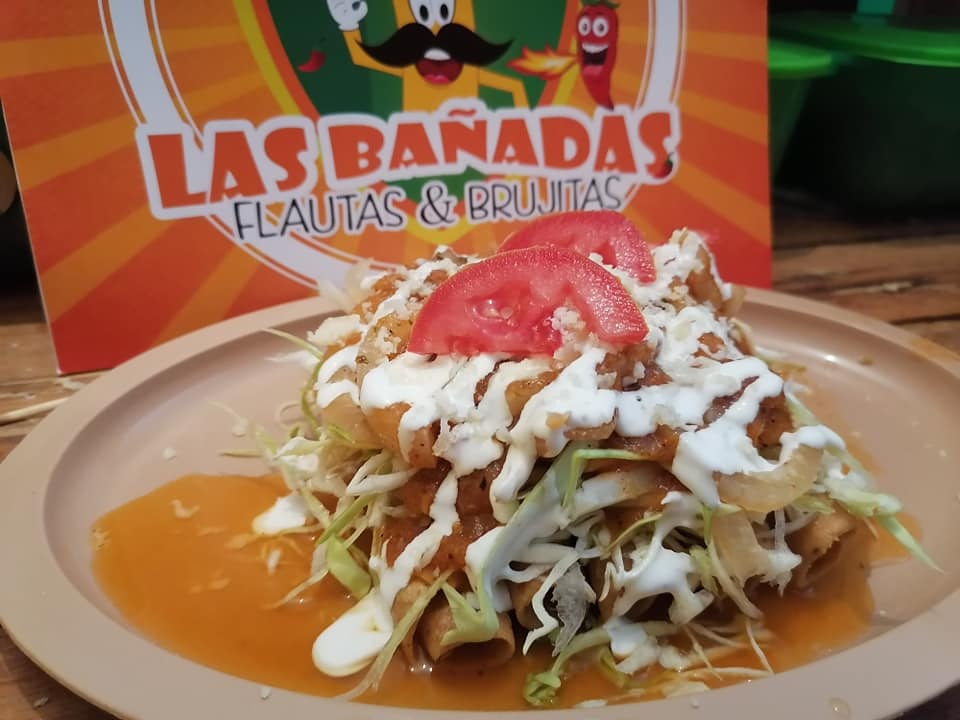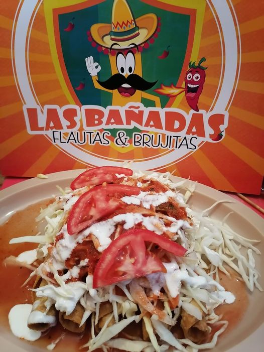5 Flautas de deshebrada acompañadas de repollo, jitomate, cuerito curtido, crema, queso rallado, bañadas en salsa especial de la casa.
