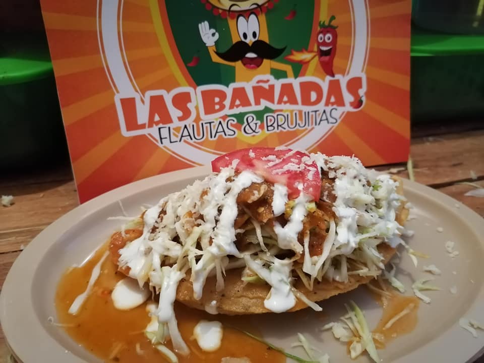Base hecha con masa de maíz, adobada, lechuga, jitomate, y salsas para bañar.