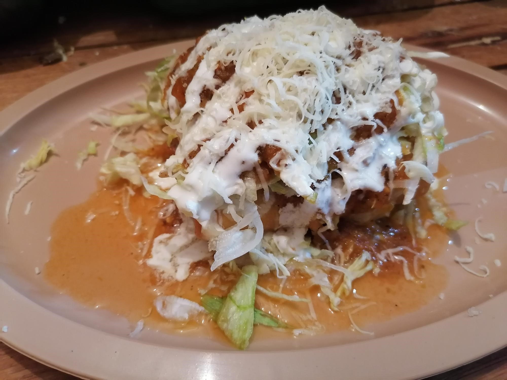Base hecha con masa de maíz, picadillo, lechuga, jitomate, cuerito curtido, queso rallado y salsas para bañar.