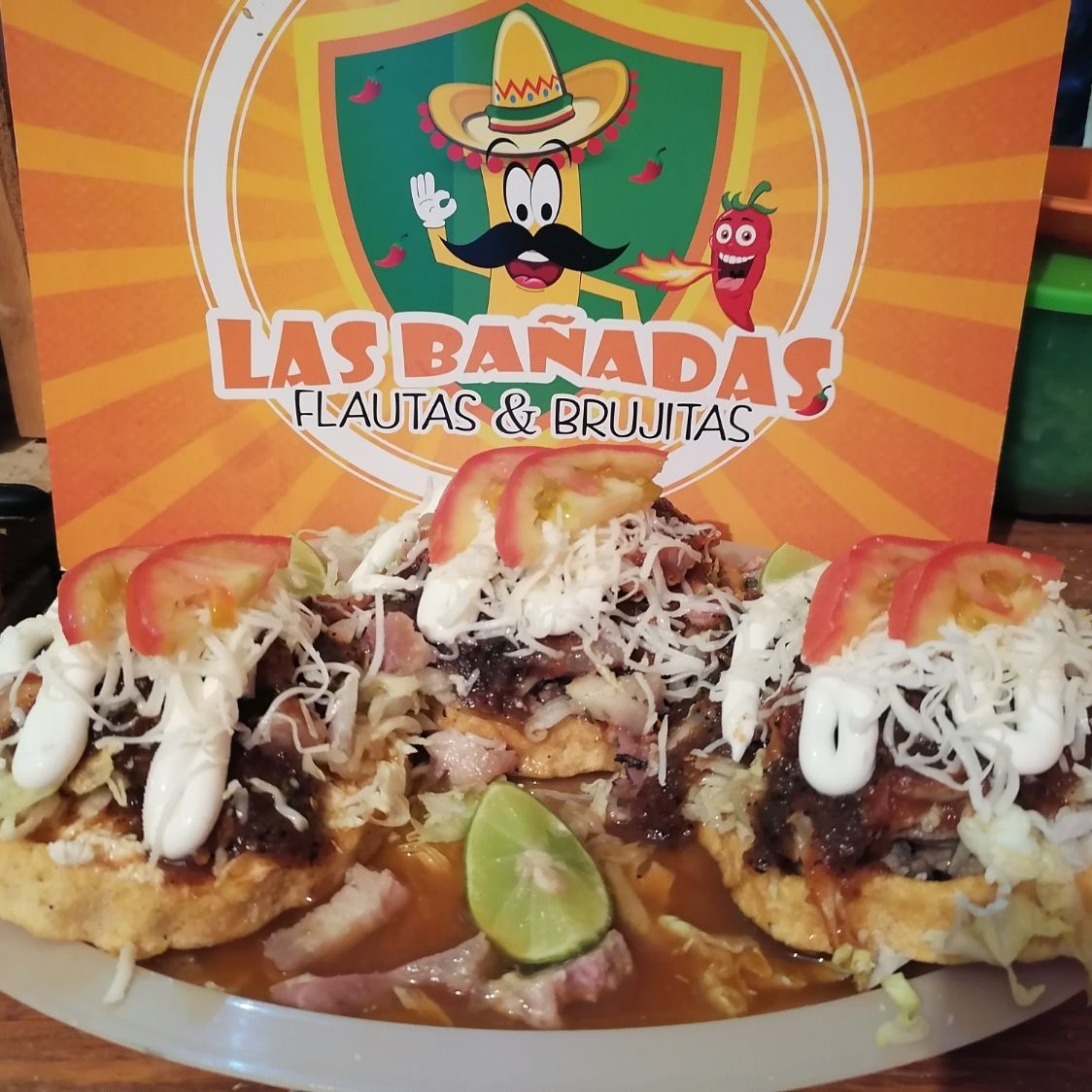 Hecha con masa de maíz rellena de bistec acompañada de repollo, cuerito curtido, crema, jitomate y queso rallado bañada en salsa especial de la casa.