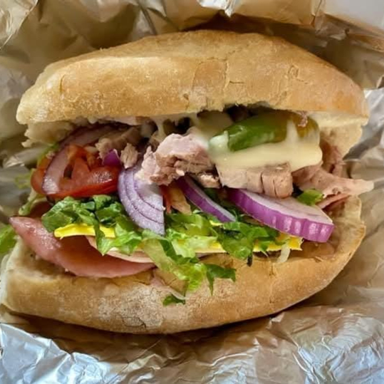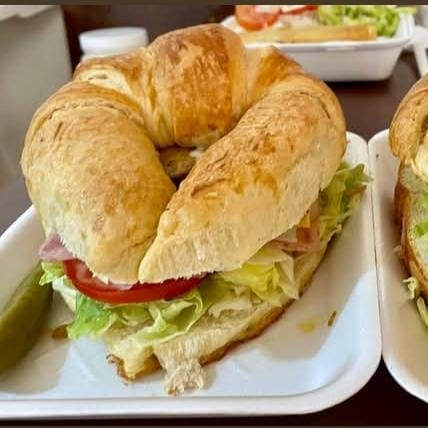 Pan de mantequilla, porcion de pollo, queso fundido, queso amarillo, jamon, lechuga tomate y aderezo ranch.