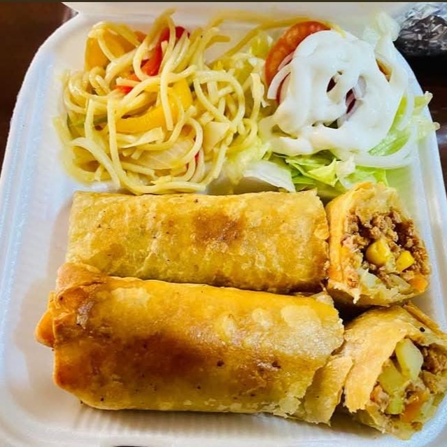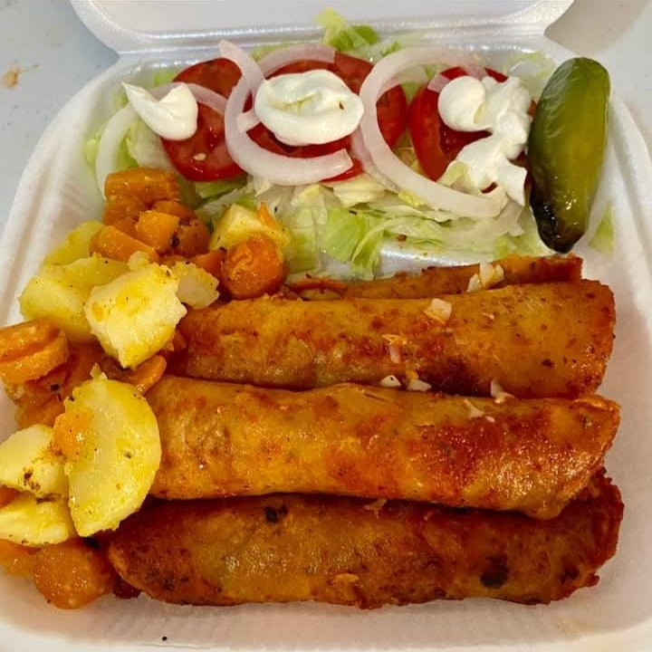 2 chimichangas tortilla de harina grande una rellena de picadillo y otra de chicharron, acompañada de espagueti y ensalada fresca de curtidos.