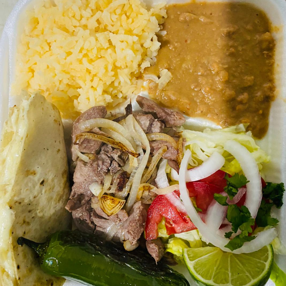 porcion de arrachera, frijoles, arroz, ensalada, quesadilla, salsa y chiles toreados.