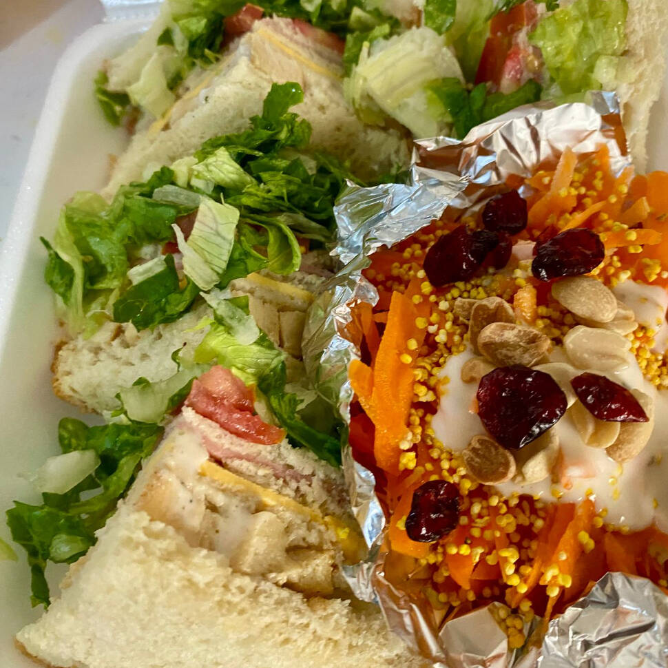 4 panes, queso amarillo, queso blanco, jamon, pollo tender, lechuga, tomate, acompañado de una porcion de ensalada de zanahoria.