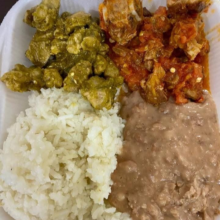 Porcion de chicharron en salsa, porcion de bisteck ranchero, tortillas, salsa, arroz y frijoles