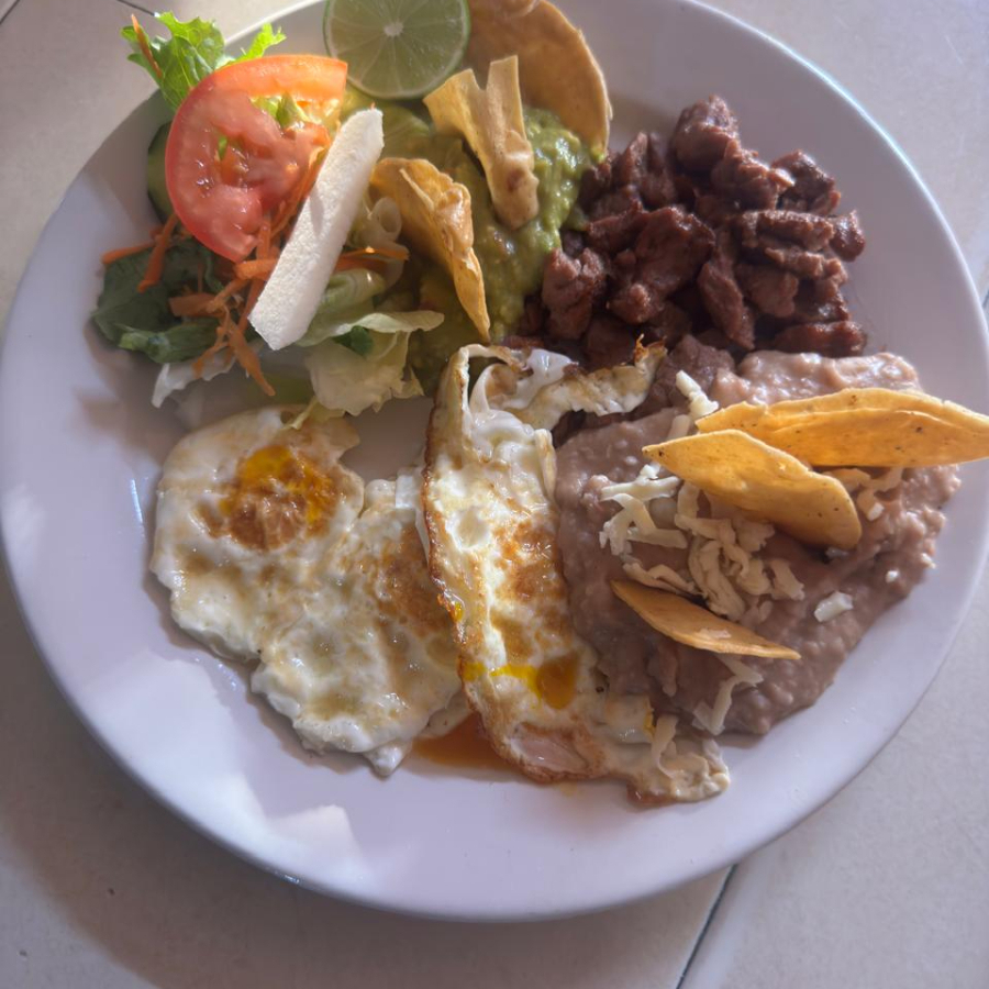 incluye, arrachera, 4 huevos estrellados, guacamole, ensalada y frijoles refritos