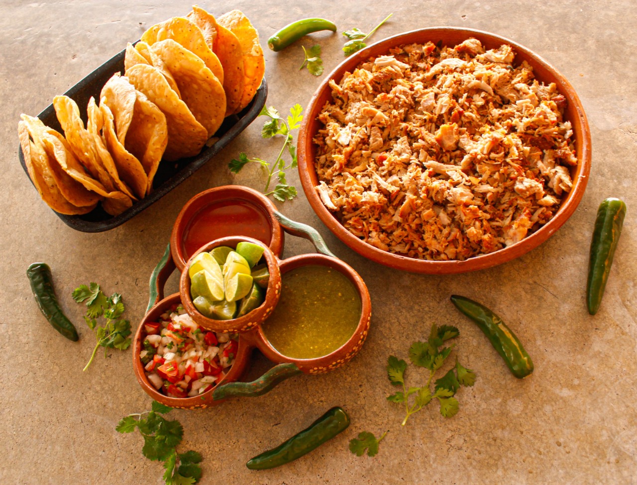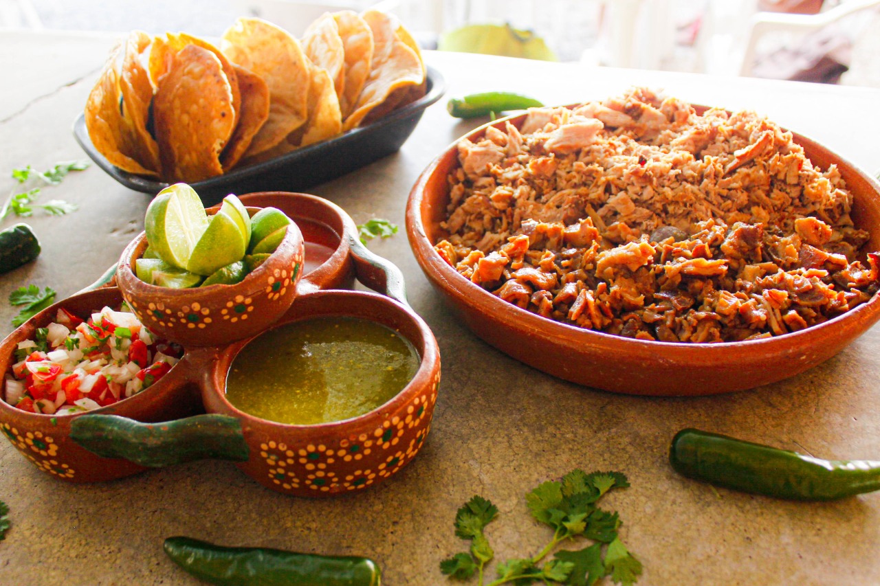 1 kg de carnitas, pico de gallo, salsas, limones y 20 tostadas.