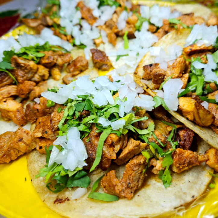 5 tacos de cabeza con cilantro y cebolla (opcionales) y salsa de la casa