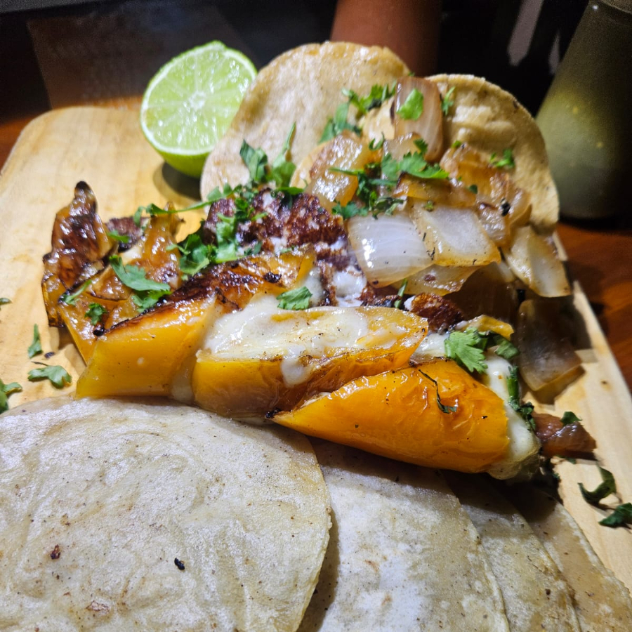 Chile güero relleno de queso, acompañado de cebollita caramelizada, tostada y 3 piezas de tortilla