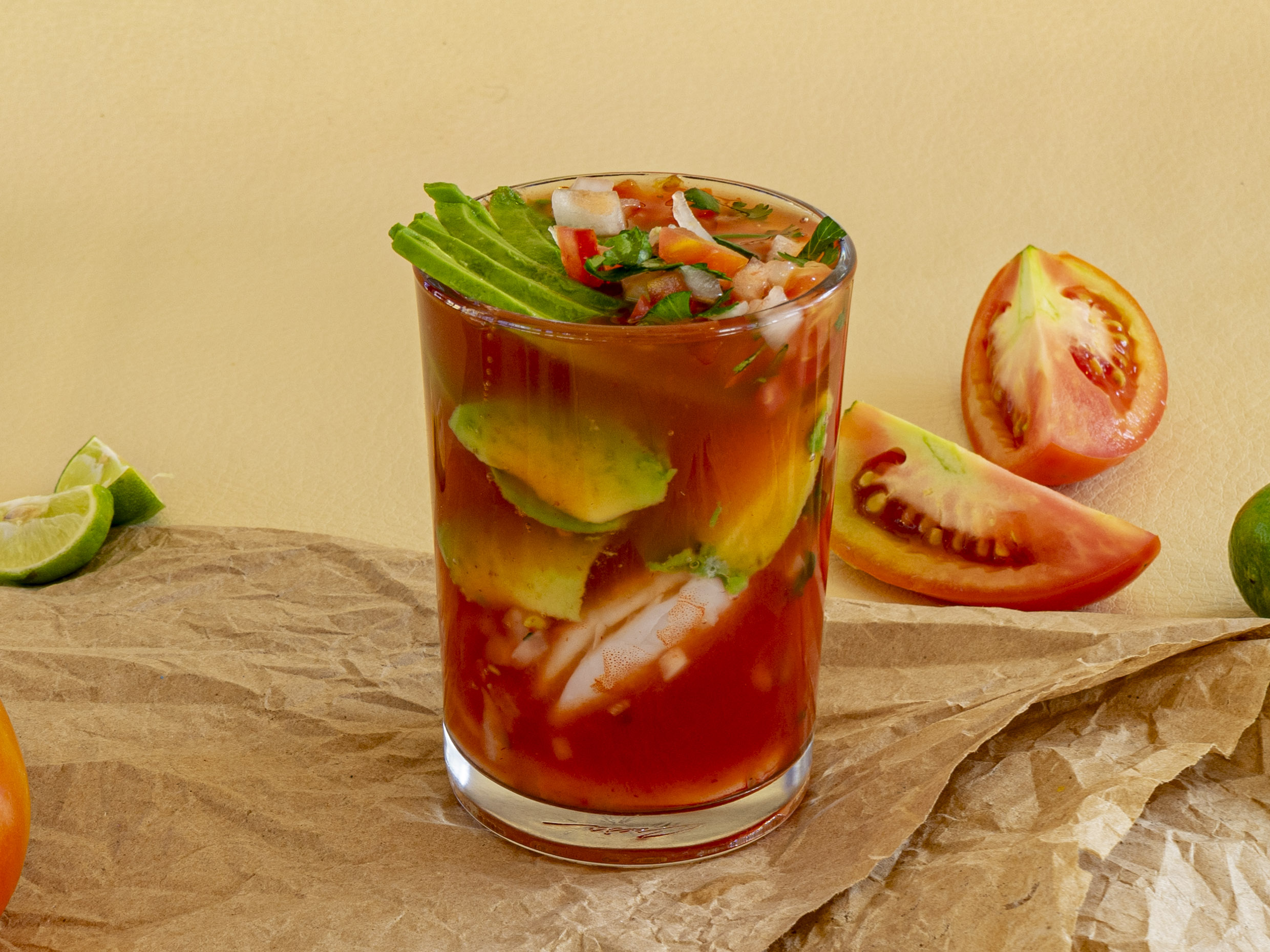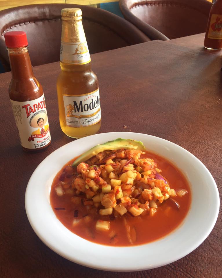 Camarón, pulpo, aguachile, cebolla, cilantro, chile serrano, jitomate, aguacate.