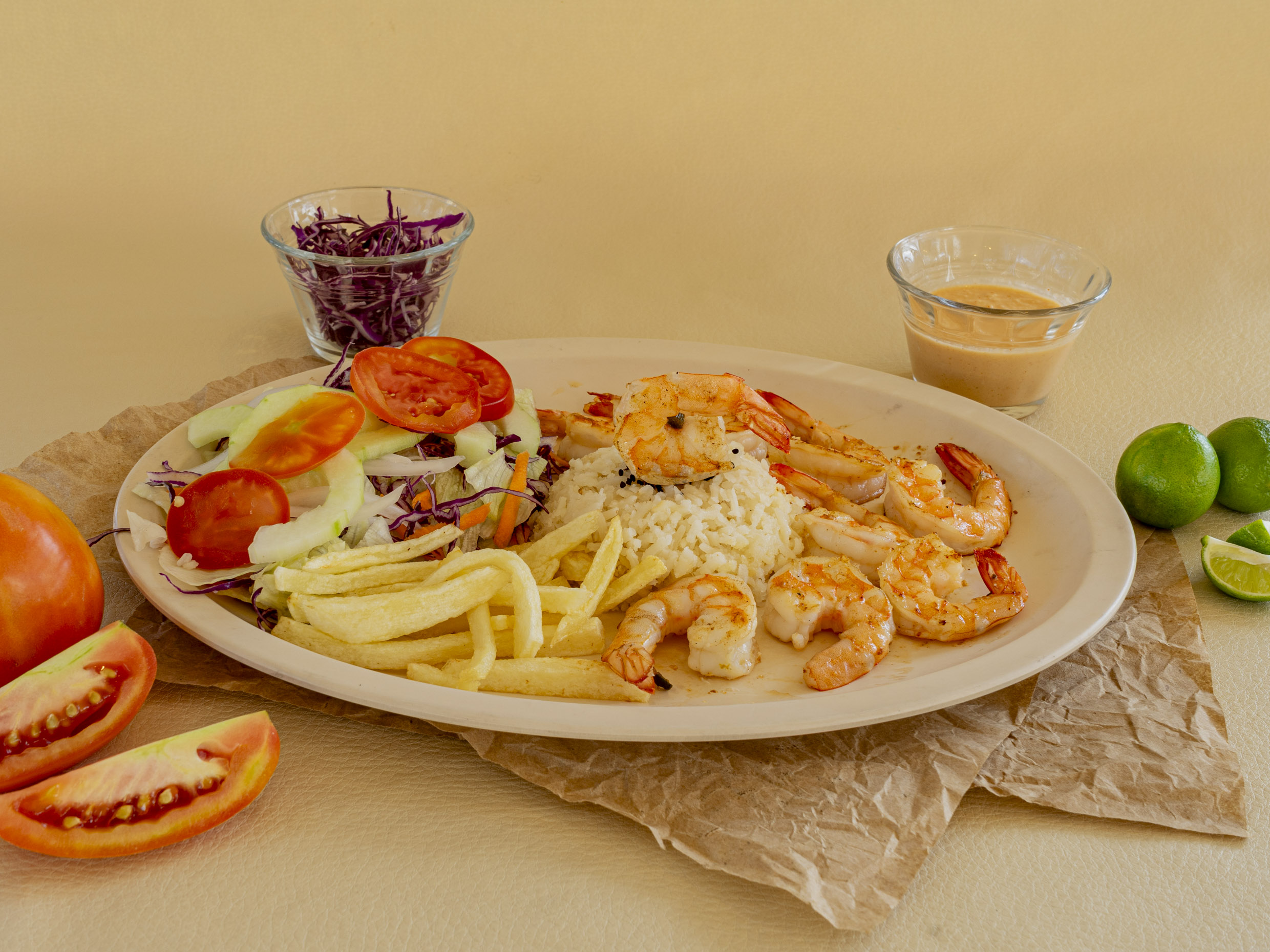 Arroz, papas, verduras, salsa chilena, salsa roja y bolillo.