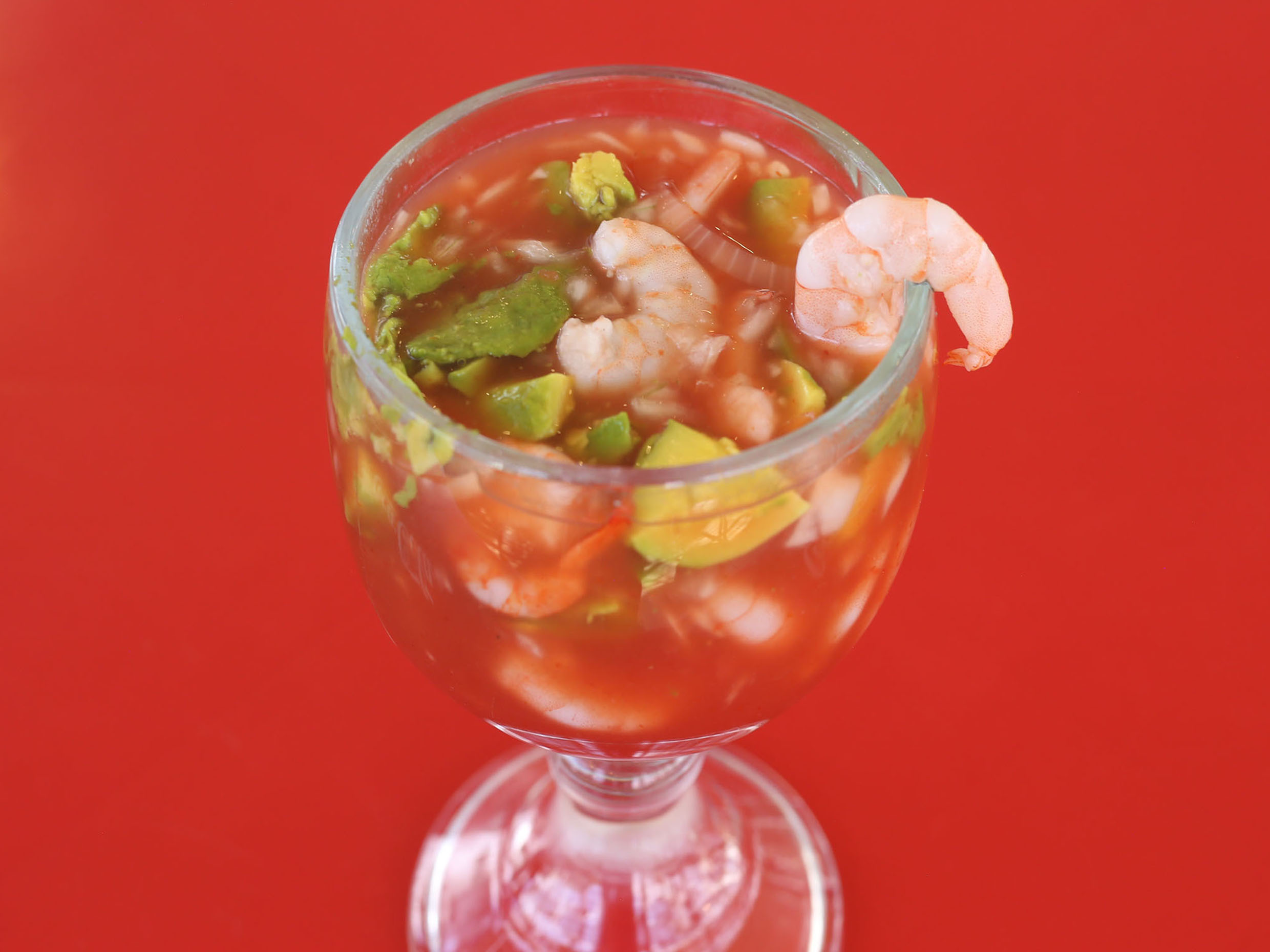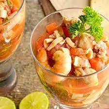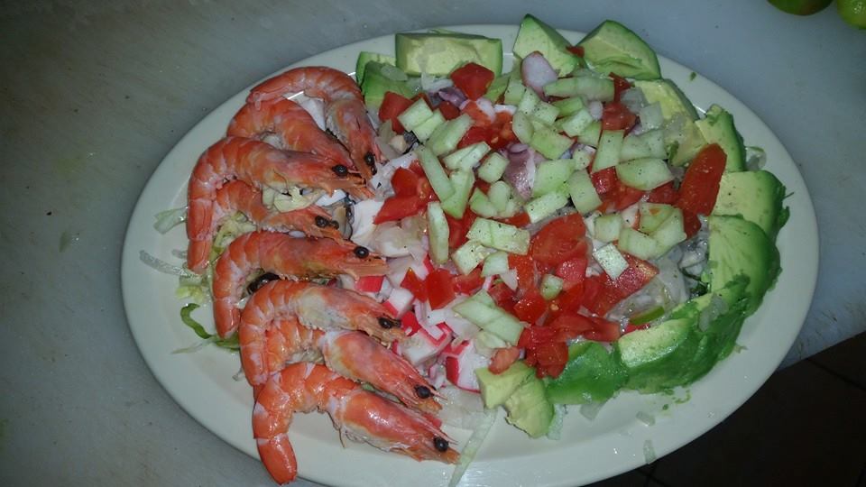 Platillo preparado con camarón cocido, camarón crudo, atún, pulpo, surimi, cebolla, jitomate y cilantro