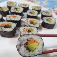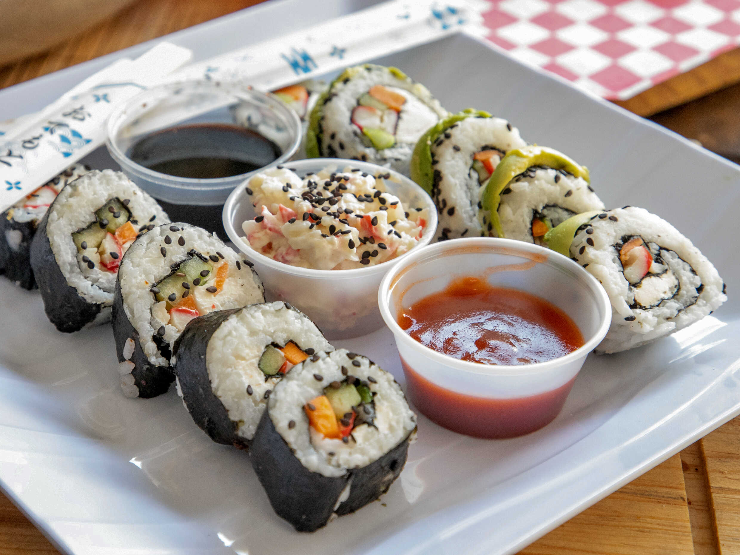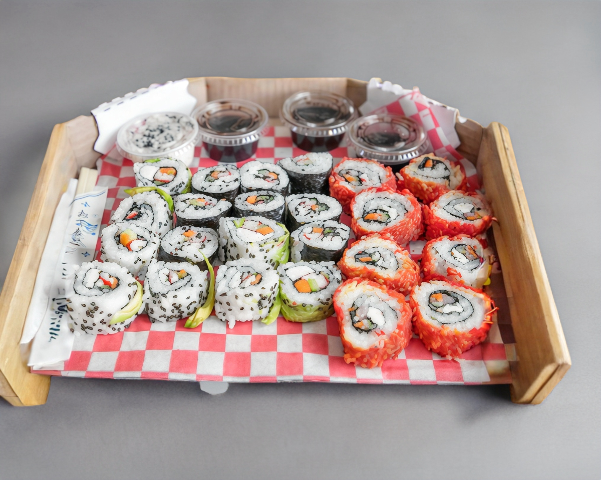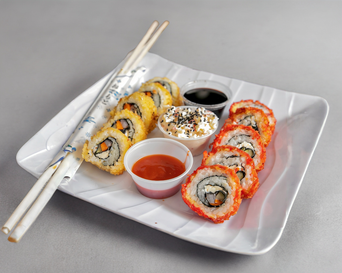 1 Rollo de sushi empanizado, 1 rollo de sushi natural, 1 rollo de sushi con ajonjolí, vegetales, salsa tampico y salsas.