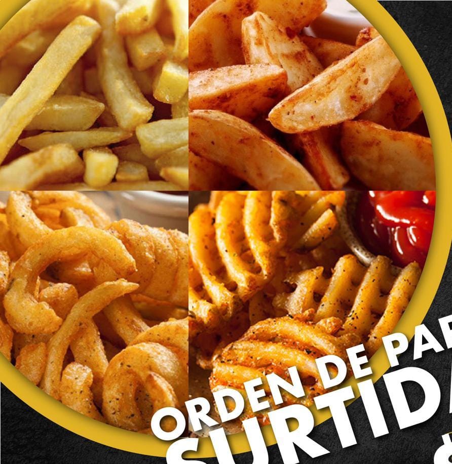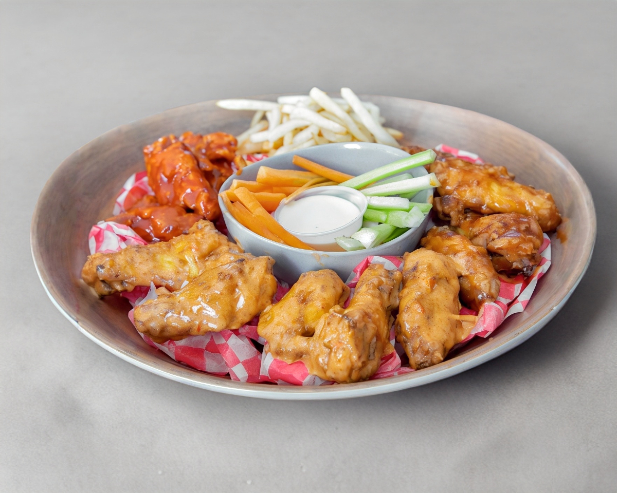 1 kg. de alitas, 1 orden de papas a la francesa, aros de cebolla, zanahoria, pepino y apio.