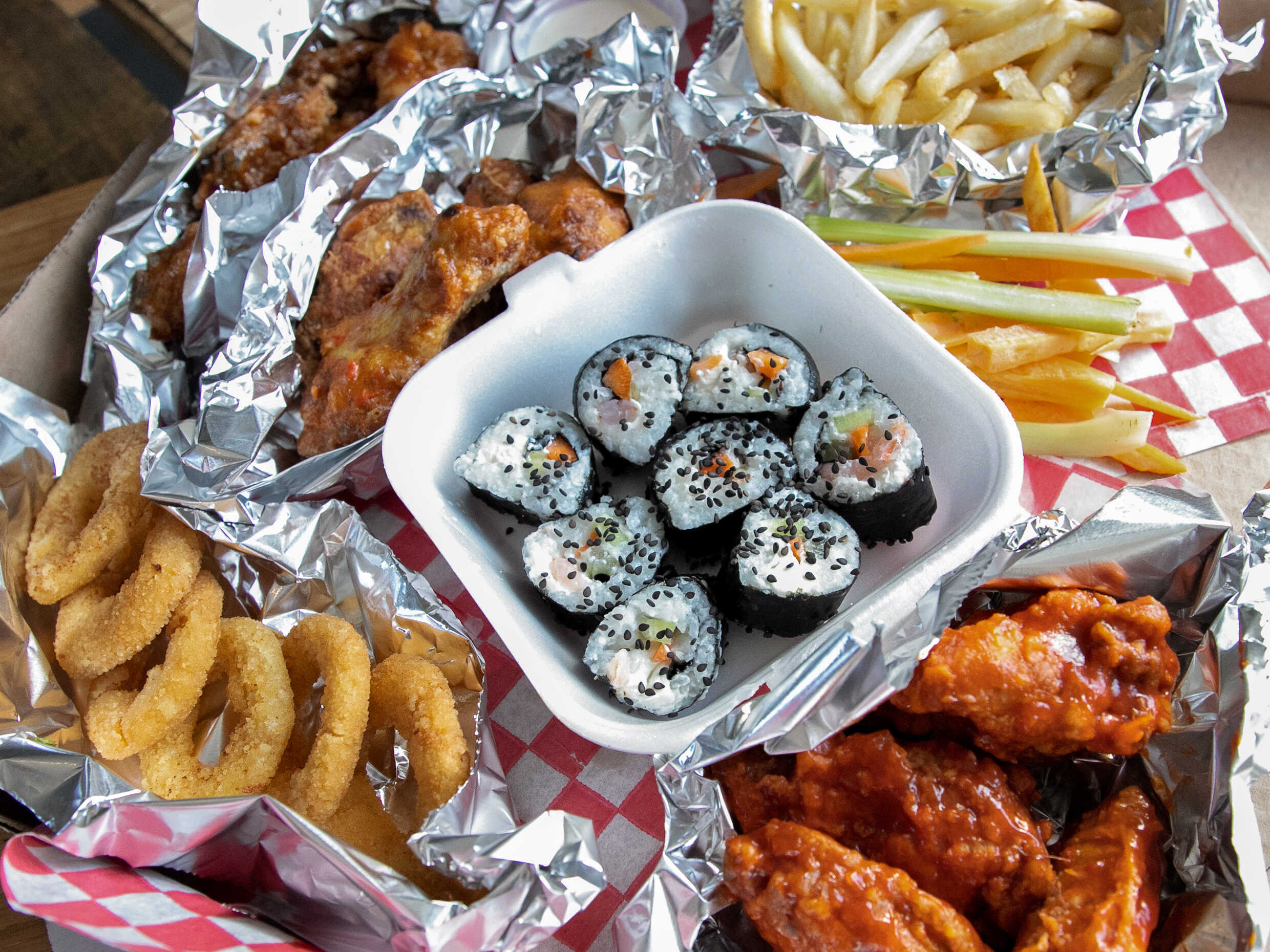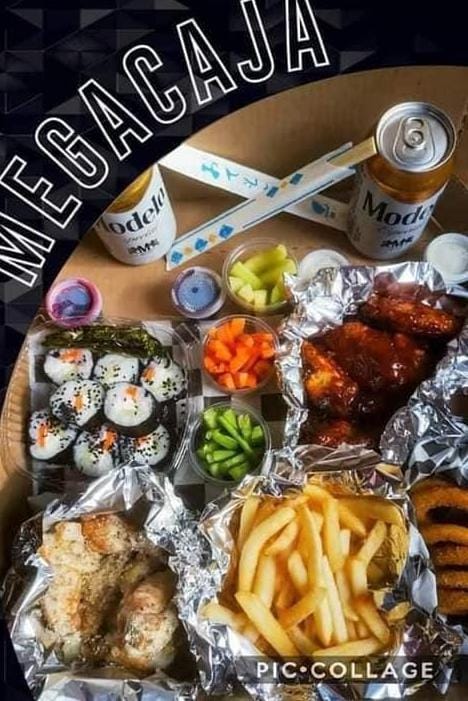 2 Rollos de sushi empanizado, 10 aros de cebolla, doritos, 16 alitas de pollo, papas gajo, vegetales, pops de pechuga de pollo, porción de queso amarillo, salsa agridulce, salsa de soya, chiles y ranch.