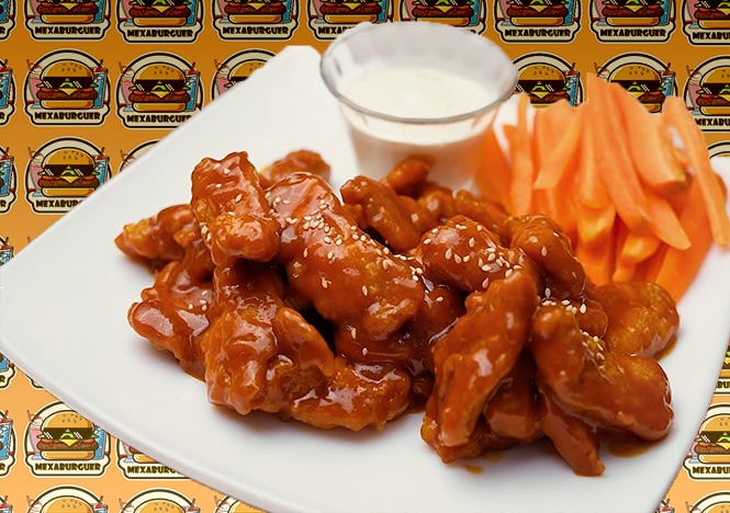 Trozos de pechuga de pollo sin hueso, empanizados y acompañados o bañados de salsa BBQ Hot