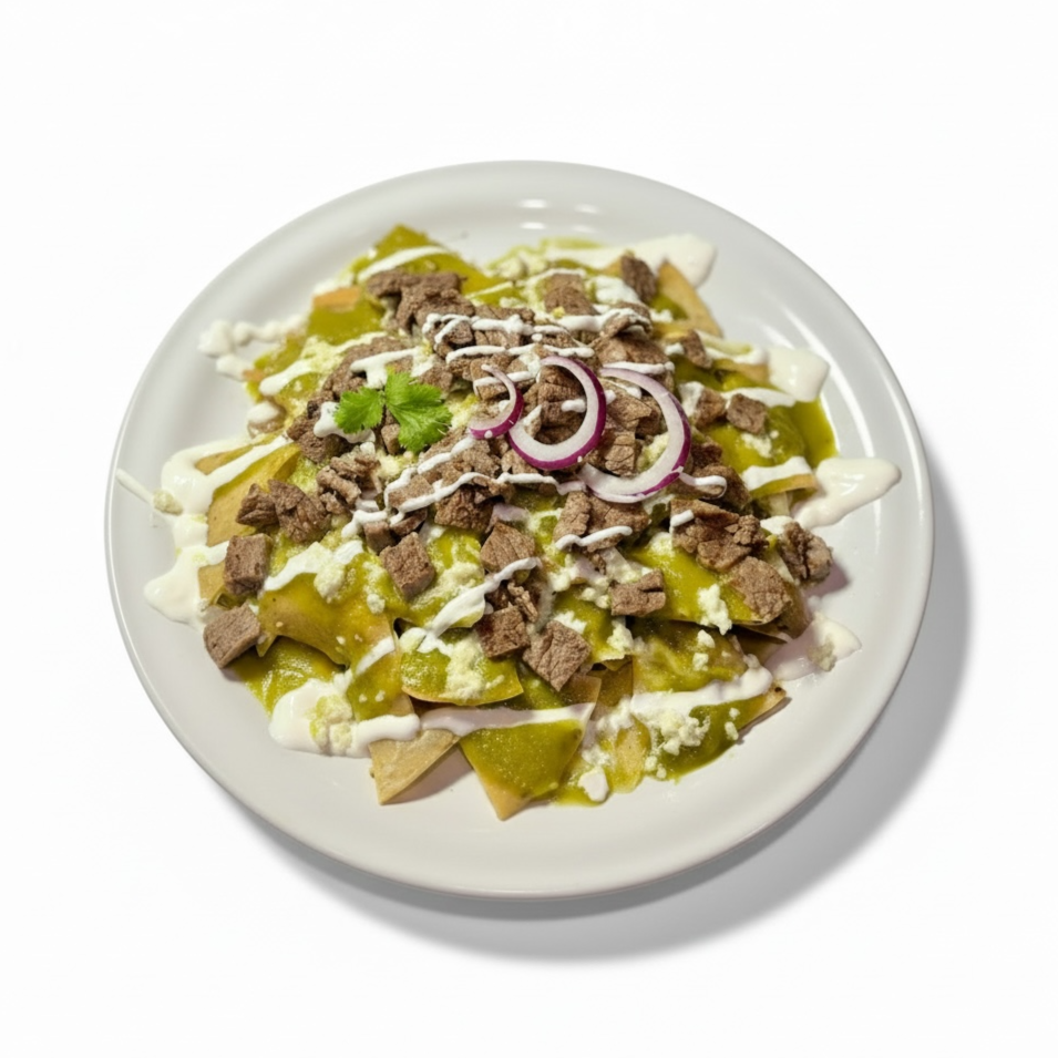 Totopos crujientes bañados en salsa verde vibrante, acompañados de jugosa arrachera a la plancha, suave y llena de sabor