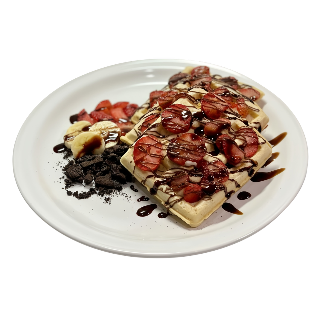 3 Waffles con fresas y platano, bañado con chocolate