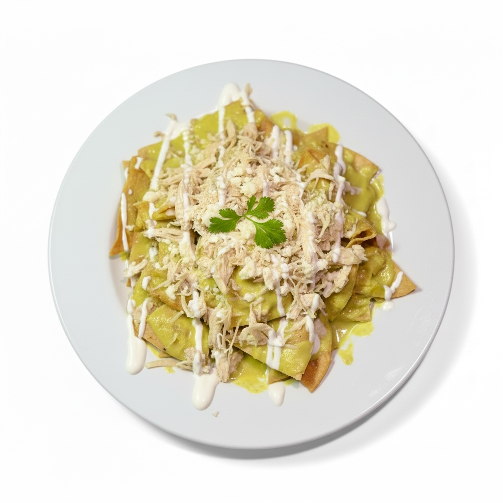 Crujientes totopos bañados en salsa verde suiza, cremosa y ligeramente ácida, coronados con jugoso pollo desmenuzado.