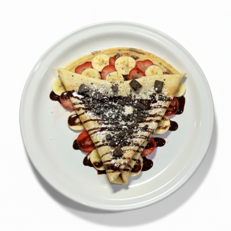 Delgada y suave crepa rellena de intenso chocolate y cremosa Nutella, acompañada de fresas frescas que aportan un toque jugoso y ligeramente ácido.