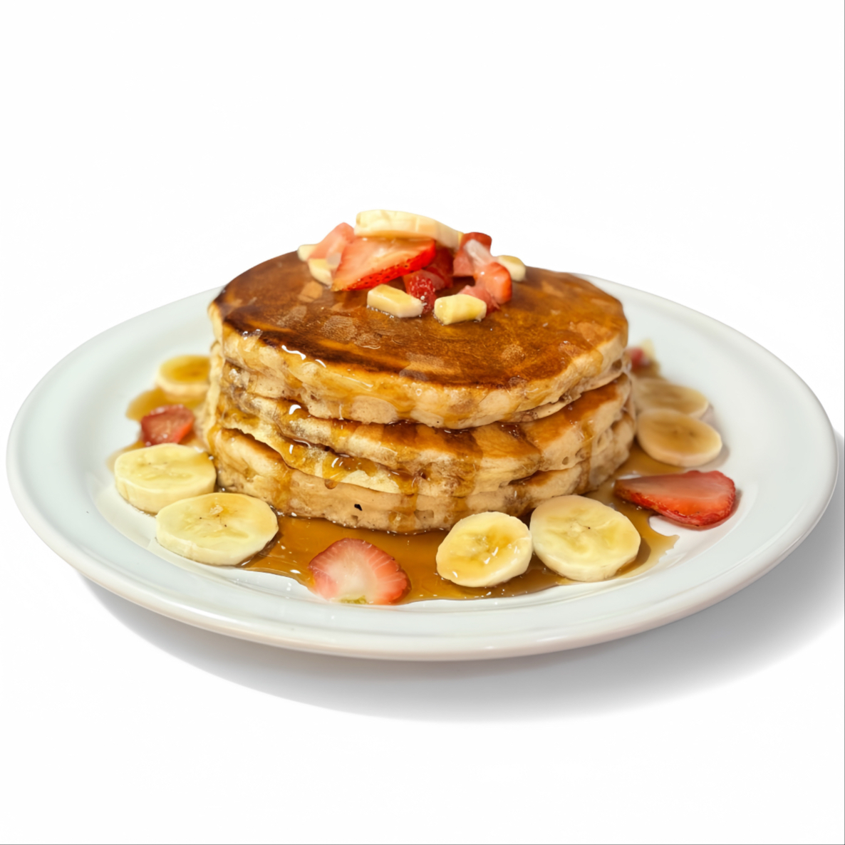 3 Hot Cakes esponjosos acompañados de plátano fresco, bañados con miel Mapple