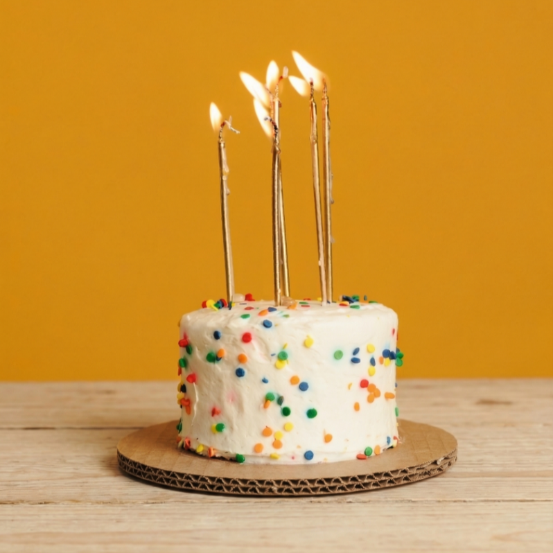 Pequito de vainilla humectado con jarabe dulce y cubierto con betún Vainilla y decorado con chispas de colores por dentro y por fuera.