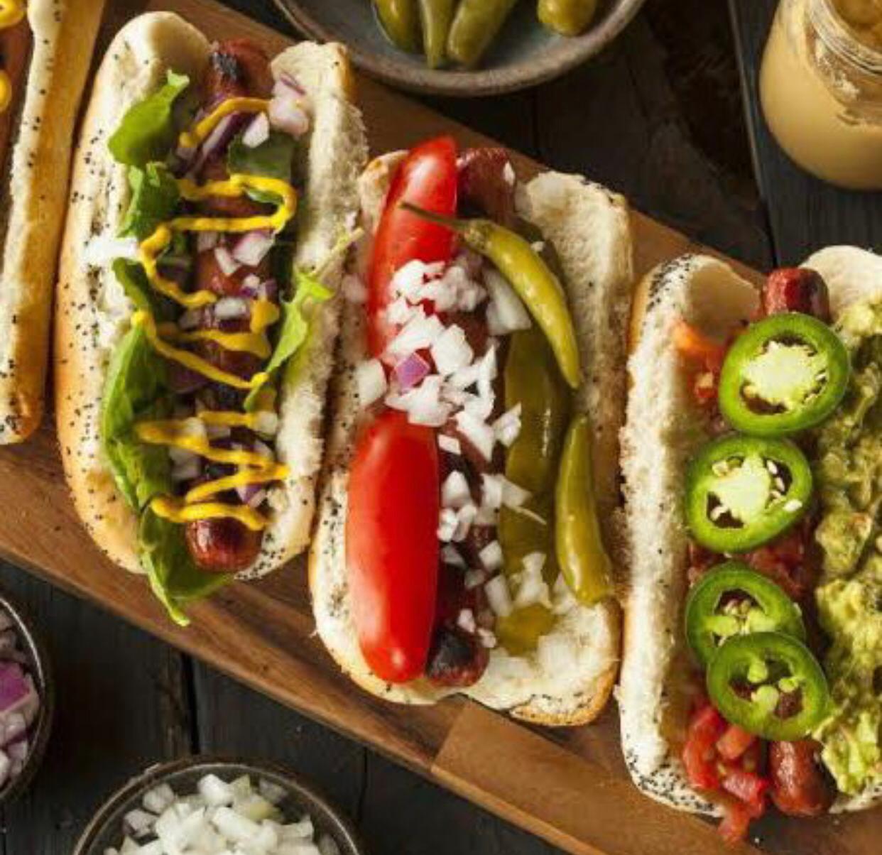 Salchicha, tocino, verdura, aderezos