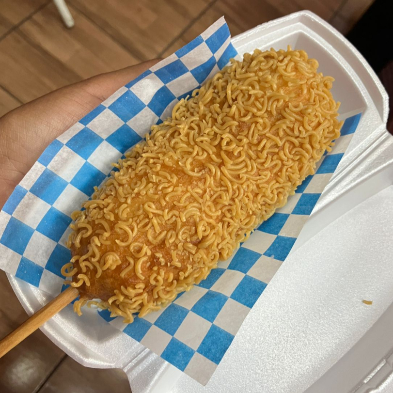 Banderilla de queso y salchicha, cubierta de ramen crujiente