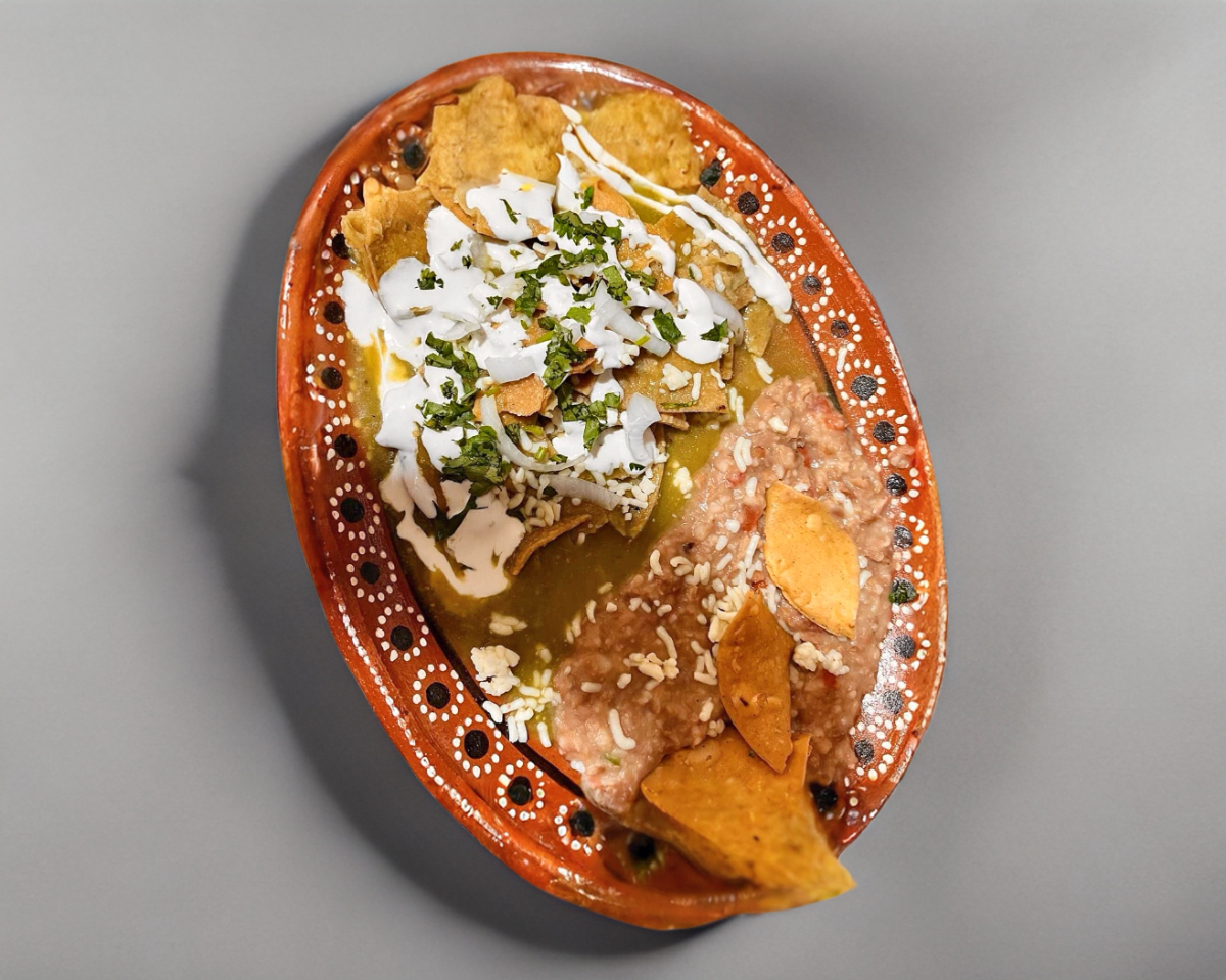 Chilaquiles al gusto queso, crema y acompañados con frijolitos. Cilantro y cebolla asada
