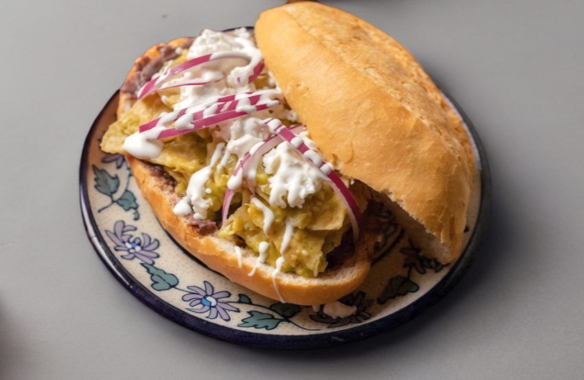 torta mr lunch con chilaquiles y la combinación de salsa que prefieras, acompañada de rico pastor de la casa