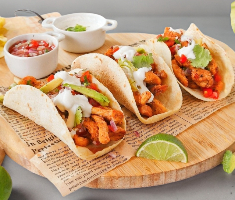 4 PIEZAS DE TACOS GRANDES EN TORTILLA DE MAIZ, CON PECHUGA DE POLLO ALA PLANCHA, ACOMPAÑADPS DE CEBOLLA ASADA, CHILE TOREADO Y PICO DE GALLO