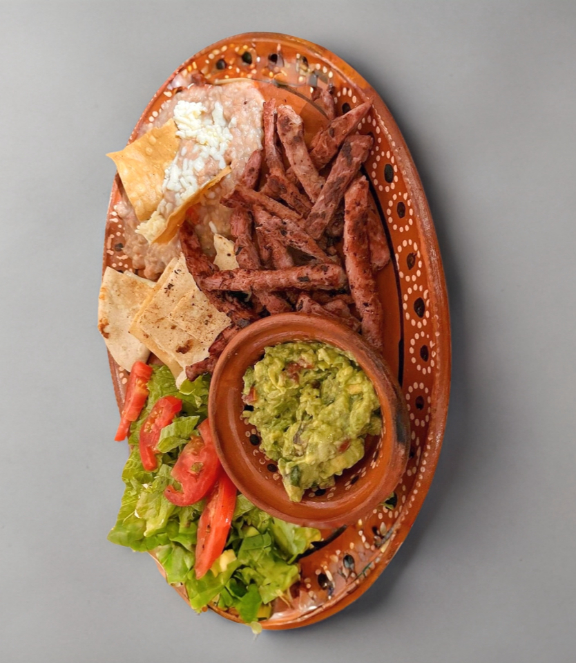 ALAMBRE DE LA CASA ACOMPAÑADO CON FRIJOLES, PICO DE GALLO, ENSALADA, SALCHICHON, CHILE CARIBE Y QUESADILLAS