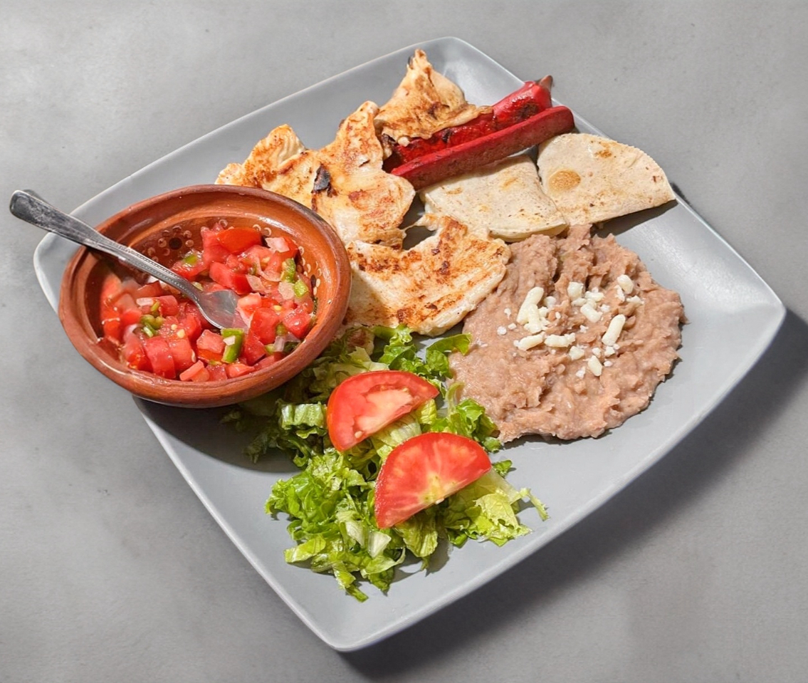 Acompañada de frijolitos refritos, ensalada, quesadillas, salchichon, chile tatemados y rica pechuga de pollo ala plancha