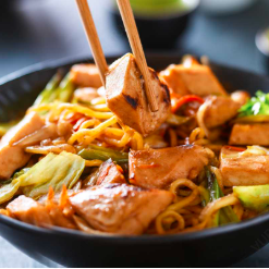 Base de 320 g mezcla de vegetales, repollo, zanahoria, calabaza y fideos salteados, adicionados con un jugosa porción de pollo sazonado con nuestra receta de la casa. ¡Saludablemente delicioso!