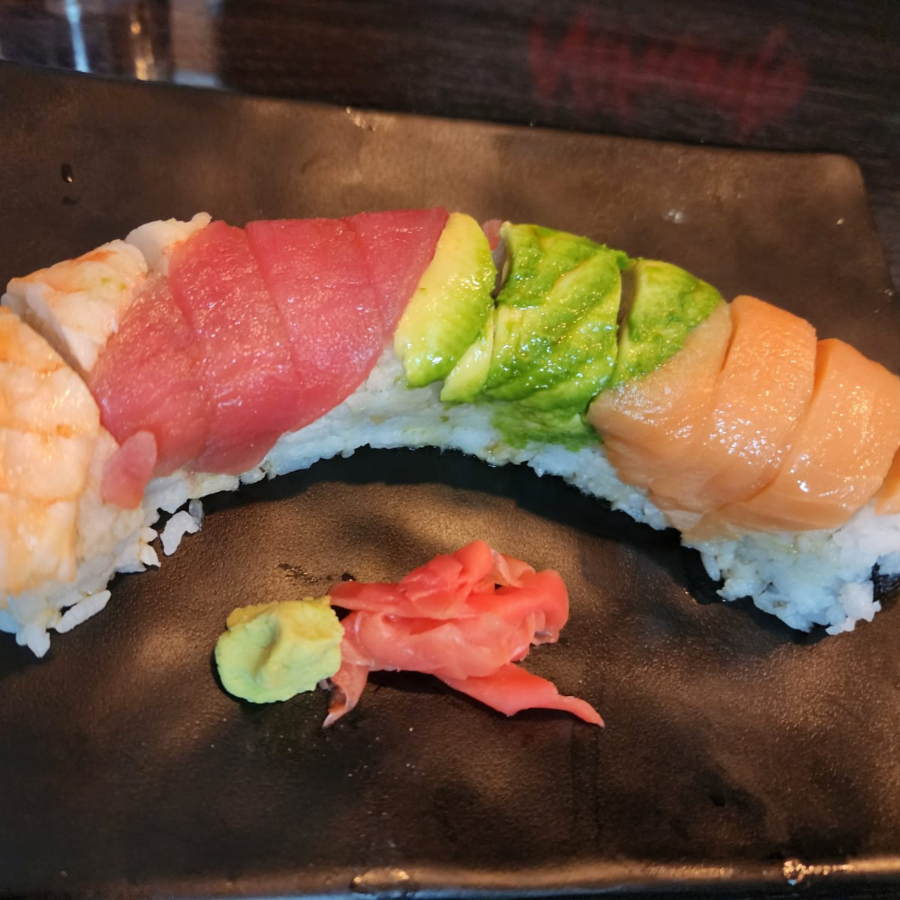 Base california roll, ebi, atún, aguacate y salmón por fuera.