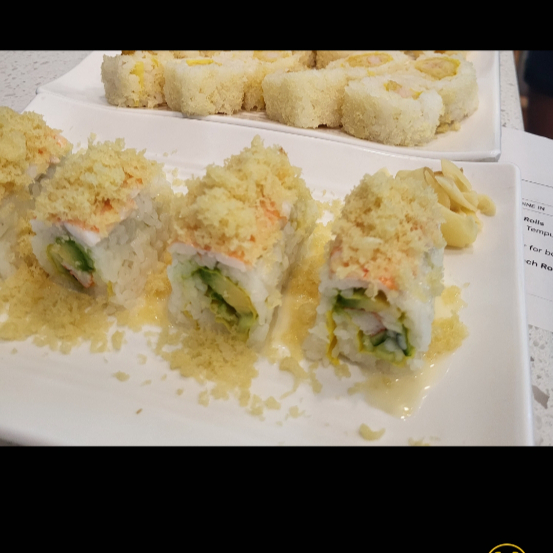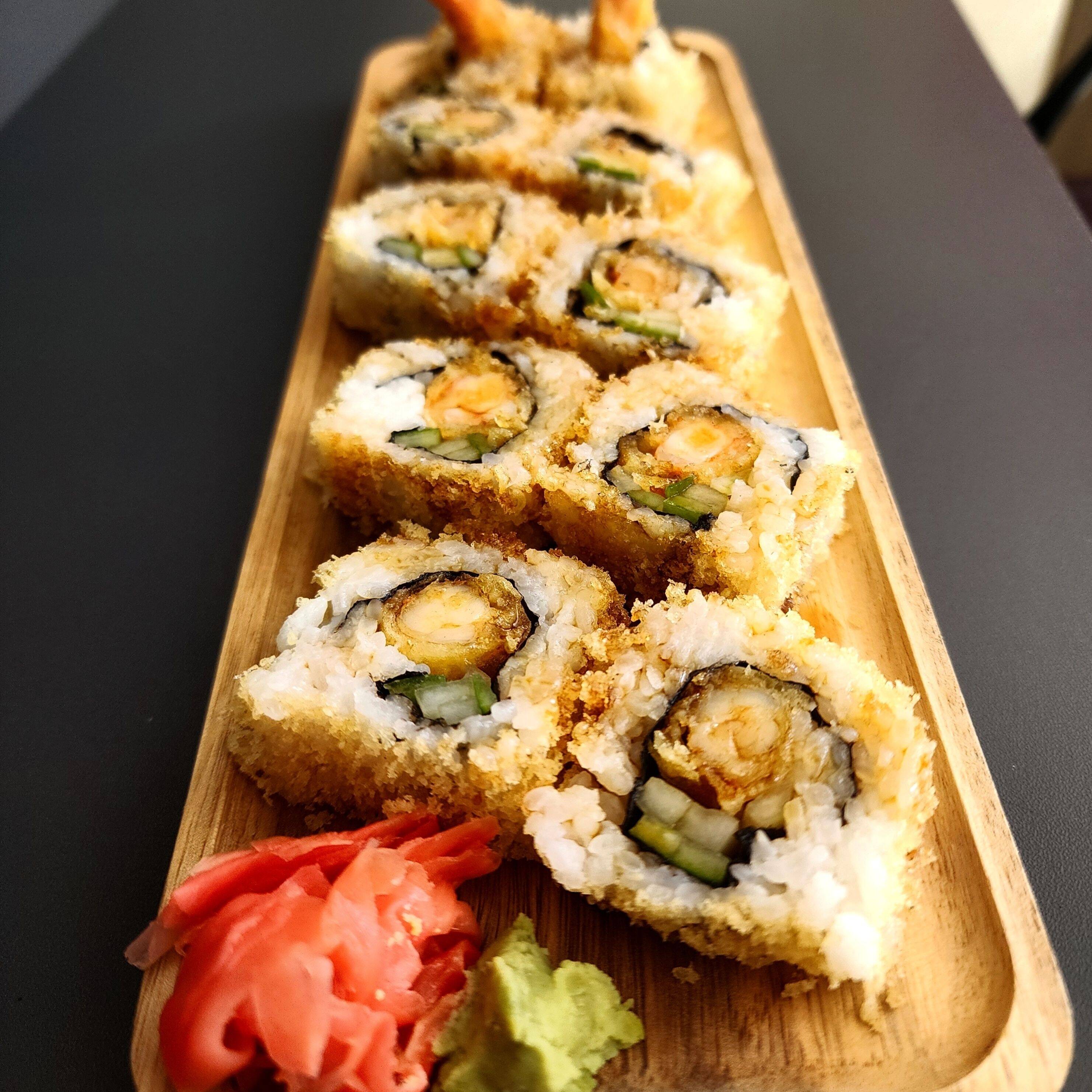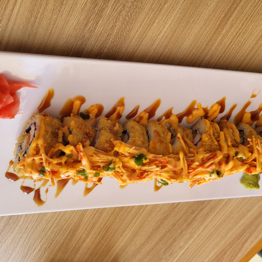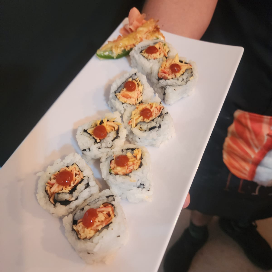 Camarón tempura, surimi y queso crema por dentro, spicy crab por arriba.