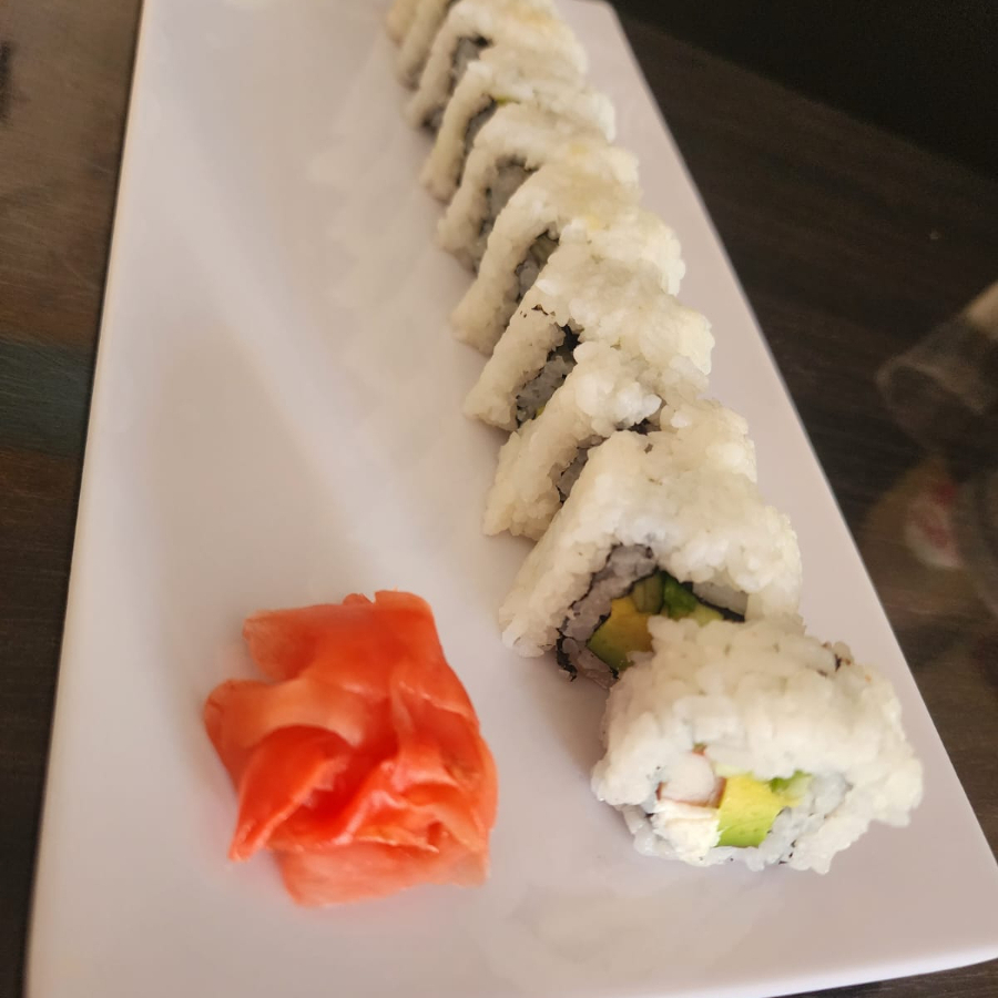 Arroz por fuera, surimi, aguacate, queso crema y pepino por dentro.