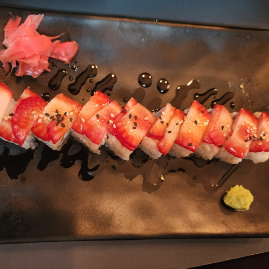 Kanikama, pepino, queso crema por dentro y fresa por fuera.