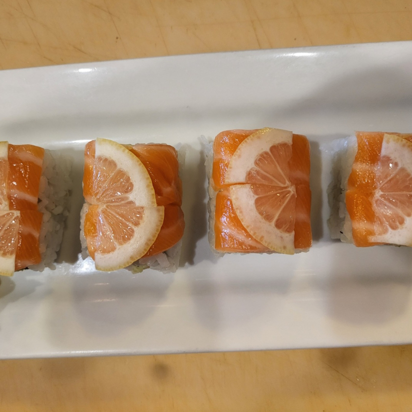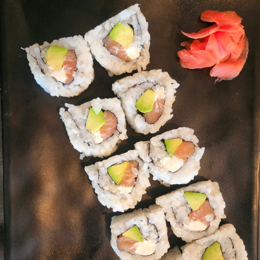 Arroz por fuera, salmón ahumado, aguacate y queso crema por dentro.